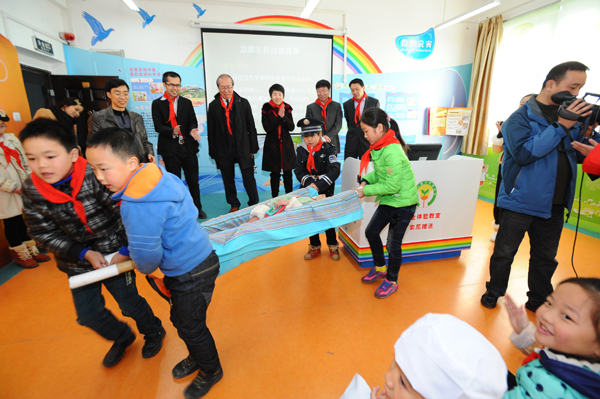 据悉,“安全体验教室”将通过“情景式和体验式”的教学模式,向中小学生普及各种应对突发事件的防范自救知识,让孩子们在生动有趣的互动教学中,学习到实用、有效的逃生自救技能,在紧急情况下,能正确应对,将灾害损失降低至最小。在“索尼安全体验教室”中,没有日常上课用的桌椅板凳,而是配置了急救互救模拟演练系统、逃生急救设施、电子安全宝典、安全小博士以及地震、洪水等自然灾害、消防安全、交通安全、社会治安等等各种安全常识的宣传展板。在现场,嘉宾们与雅安市雨城区第四小学的孩子们一起体验了一堂“安全体验教学公开课”。课堂上,老师组织学生进行逃生自救演练,包括烟道逃生、灭火器模拟灭火、拨打报警电话、急救包扎等。演练后,学生们还与嘉宾一起,进行了简易担架制作及伤员搬运友谊赛。