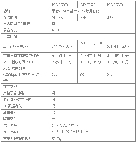 MP3 播放功能:ICD-UX 系列同时也具备数字音乐播放器功能,其最大可存储约545首MP3 歌曲2,播放时间长达36小时20分3。由于支持ID3标签,ICD-UX 系列产品在播放音乐的同时,也可显示歌曲名称和歌手名称。由于文件夹按照语音和音乐文件的顺序进行排列,用户可轻易地管理和查找所需的语音文件和所喜爱的MP3歌曲。