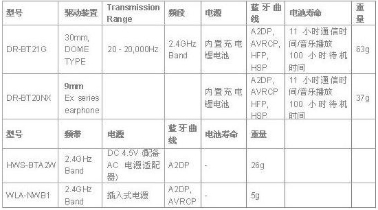 蓝牙耳机DR-BT21G和DR-BT20NX,便携式蓝牙传送器WLA-NWB1以及双向蓝牙传送/接收器HWS-BTA2W将于近期在国内市场销售。