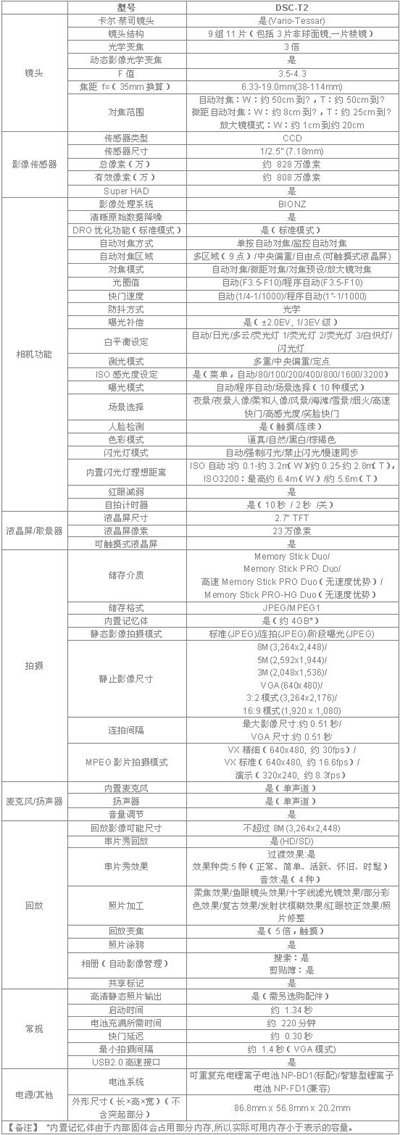 附:Cyber-shot DSC-T2数码相机详细规格