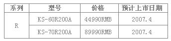 2007年4月23日,索尼(中国)有限公司在北京“索尼探梦”科技馆发布了SXRD电视机R系列新品 -- 尺寸分别为60寸的KS-60R200A和70寸的KS-70R200A,这是首款索尼在中国市场推出的大屏幕SXRD电视机。新产品的推出,不仅标志着由索尼自主研发的SXRD技术在中国市场进入更广泛的应用领域,也将加速推进“高清影院家庭化”进程。