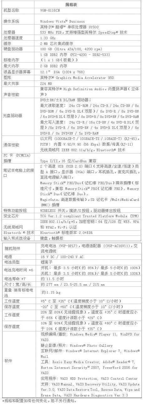 2007年1月15日,索尼(中国)有限公司对中国大陆地区正式发布了索尼VAIO旗下最新款12英寸全内置VAIO G系列VAIO VGN-G118CN/B(黑色)与VAIO VGN-G118CN/T(咖啡色)。轻薄、坚固机身和超长电池续航能力以及首批预装微软最新的Vista Biz操作系统使VAIO G成为商务笔记本电脑中的一大亮点。