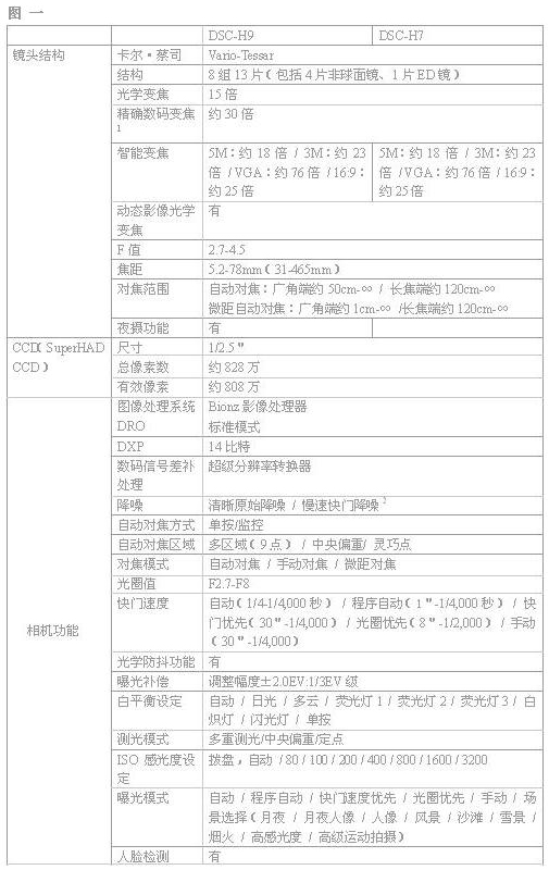 2007年3月7日---索尼Cyber-shot H系列大变焦数码相机一直备受准专业人士和高端家庭用户欢迎。此次,索尼(中国)有限公司再次发布两款新品——DSC-H9和DSC-H7。它们均持有1/2.5”810万有效像素“Super HAD”CCD、15倍光学变焦卡尔•蔡司“Vario-Tessar”镜头及Bionz影像处理器,焦距覆盖了从31mm广角到465mm超远望的所有焦段,擅长风光、人像、微距、体育等多种题材拍摄,让摄影爱好者能体验多种题材的拍摄乐趣。