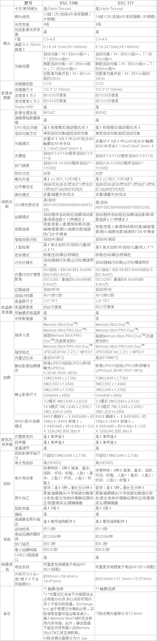 附:Cyber-shot DSC-T700 DSC-T77数码相机详细规格