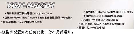 从1月24日起,索尼(中国)有限公司在新春到来之际,推出素雅简约的索尼VAIO NR系列笔记本升级版本VAIO VGN-NR23H。该款笔记本不仅保留了NR系列索尼卓越的工业设计和使用美学。结合消费者的使用体验,在NR12H的基础上, 新推出的VAIO NR23H的内存升级到1GB,同时搭载了性能强大的NVIDIA® GeForce® Go 8400M GT独立显卡。使其影音性能得到大幅提升,而NR23H的价格依旧平易近人,正式售价为人民币6988元。作为送给家人的特殊礼物,索尼VAIO NR23H将照顾到家中各个成员在日常生活中的使用需求!