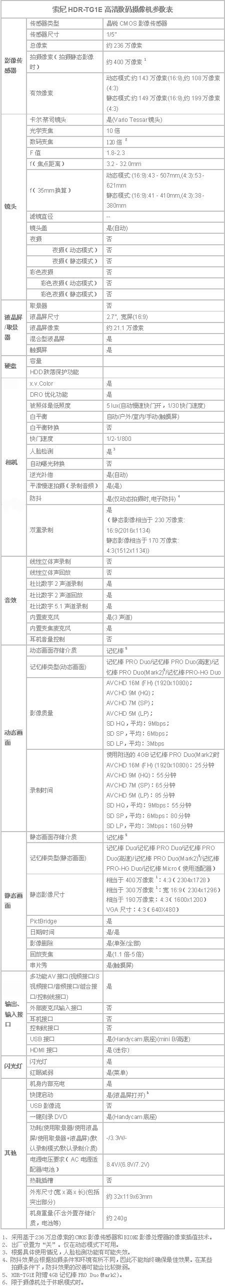 TG1E采用晶锐CMOS影像传感器和强大的BIONZ影像处理器,提供了低噪点图像、低光照感光度和清晰度。继续沿用专业级的卡尔•蔡司Vario-Tessar镜头,具备10倍光学变焦,使拍摄的画面更加清晰,细节表现更加细致。有效保证色彩逼真还原的x.v.colour技术也依然被TG1所沿用,确保拍摄画面的色彩更加艳丽。1920*1080i的高清动态影像录制和最高 400 万像素 (4:3) 的高画质静态图像拍摄让你的创作“动静两相宜”。TG1还配备了2.7’’宽混合型液晶屏,随时随地惬意欣赏拍摄的视频,感受高清画质的乐趣。