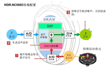 降噪耳机的原理是利用降噪电路分析周围的电路以及耳机主体内小型噪音检测麦克风收集到的周围噪音,发出降噪信号。MDR-NC500D通过直径为40mm的专业驱动单元,收集周围的噪音,再采用新开发的DNC数字降噪引擎,将噪音数字化,产生准确的反相信号与音源信号同步输出,有效实现降噪效果,还您纯净听音空间。