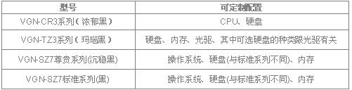 目前,索尼VAIO开始接受定制服务的产品型号分别是VAIO CR3浓郁黑系列,TZ3玛瑙黑系列和SZ7系列中的尊贵系列及标准系列。