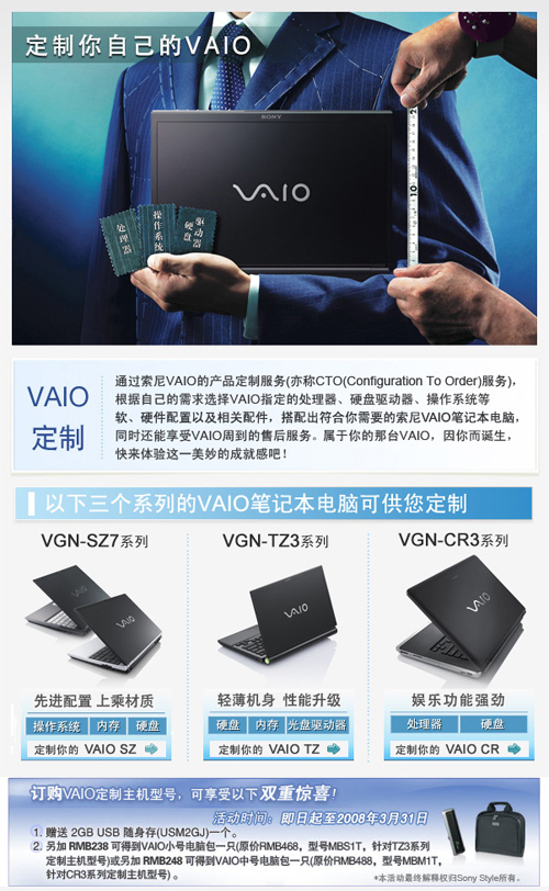 索尼(中国)有限公司VAIO市场部门的负责人介绍,该定制服务的机型将会与在零售渠道所发布的机型略有区别,目的是为了更加灵活地满足中国地区消费者个性化的产品配置需求。作为服务启动的推广手段之一,4月份之前成功完成CTO定制服务的VAIO用户还可以获赠索尼2G USB随身存;以及原厂电脑包的购买优惠。