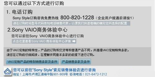 索尼(中国)有限公司将从2008年3月3日起在中国大陆地区推出“VAIO产品定制服务(CTO: Configuration To Order)”。该项产品定制服务是指消费者可以根据自己的需求在VAIO的指定目录内选择构成VAIO笔记本电脑的处理器、硬盘驱动器、操作系统等软、硬件配置以及相关配件,搭配出符合个人喜好和预算需求的VAIO笔记本电脑,并同时享受索尼“安心与便利”的售后服务。目前,消费者可以在Sony Style网站上查询,也可以通过800-820-1228免费服务热线,以及遍布全国的38家VAIO商务体验中心和索尼销售体验店进行定制。