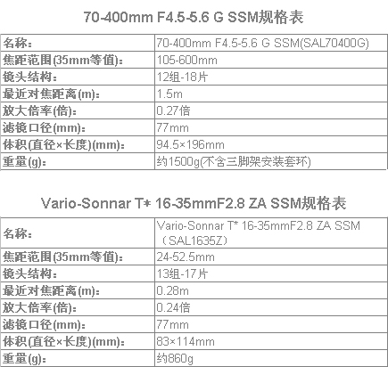 伴随a900的发布,索尼此次发布了两款高端镜头,分别是G系列最新的70-400mm F4-5.6 G SSM镜头、以及卡尔•蔡司Vario-Sonnar T* 16-35mm F2.8 ZA SSM镜头,有力扩充了a数码单反系统在高端镜头方面的实力。