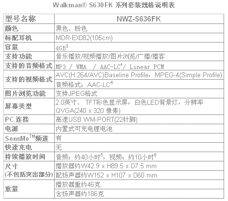 与扬声器一体搭配的Walkman® NWZ-S636F集播放音乐、视频、观看照片、收听FM广播等多种功能于一身,满足用户的多种数字娱乐需求。NWZ-S636F播放器秉承了索尼Walkman®一贯的高音质传统,具备数码音效提升引擎(DSEE),高保真立体声和清晰重低音等索尼核心技术,以实现高品质的音乐回放和震撼人心的重低音效果。同时,作为S系列播放器的一员,S636F播放器的另一亮点是内置SensMeTM频道,利用索尼简易音乐资料检索技术(LCMIR),根据歌曲的基调、速度和音调,自动建立不同的播放列表,让你轻易选取适合自己心情的音乐。