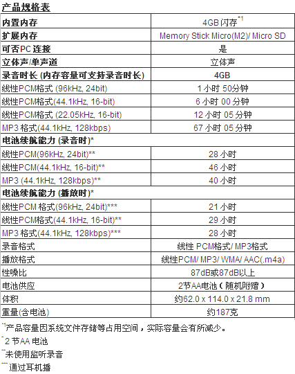 新款PCM-M10内置有4 GB* 的闪存记忆体,在线性PCM录音模式下可支持96kHz 24bit录音格式长达约1小时55分钟录音(4GB*1内存容量在供电充足的前提下可实现的录音时长),对应CD音质的16bit/44.1kHz格式可以录音约6小时左右。对录音时间要求较高的用户,则可通过使用记忆棒(PCM-M10具备MicroSD / Memory Stick Micro M2™ 插槽)来扩大容量,延展录音时长。