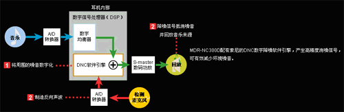 集成的 DNC 处理器采用的 Sony 独特数字降噪技术和高质量音频处理技术完全发挥了数字处理的优点。噪音侦测麦克风拾取的噪音由 A/D 转换器进行数字化,并且由处理器核心 DNC Software Engine 经高速、高精度数字滤波器处理从而产生最佳的降噪信号。