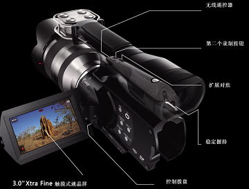NEX-VG20E、NEX-VG20EH使用了3.0英寸触摸式Xtra Fine 270°可翻转液晶屏,方便操作,尤其在低机位拍摄时,可右手持机,左手通过液晶屏控制拍摄与暂停;按键方面,新品在机身右侧前部增加了扩展对焦与拍摄按钮,方便低角度拍摄。在机身左前下方,增加了可控制的拨盘,即便关闭液晶屏时,也方便操作。