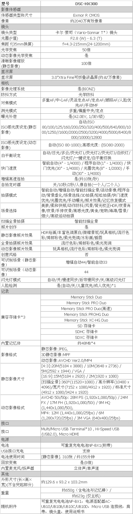 索尼(中国)有限公司于2013年3月5日推出了Cyber-Shot 数码相机新品DSC-HX300。作为索尼长焦相机的经典,DSC-H系列主打大变焦与高画质,此次发布的DSC-HX300采用了高达2040万有效像素的Exmor R CMOS背照式影像传感器,配以卡尔•蔡司Vario-Sonnar T* 50倍变焦镜头。同时采用改进过的光学防抖、高速自动对焦和多种手动功能,DSC-HX300堪称是一款真正的旗舰机型,实现了高倍变焦与优秀画质的完美演绎。DSC-HX300拥有类似专业单反/单电的机身设计及操控体验,能满足家庭旅行及户外风光摄影等不同题材的需求。