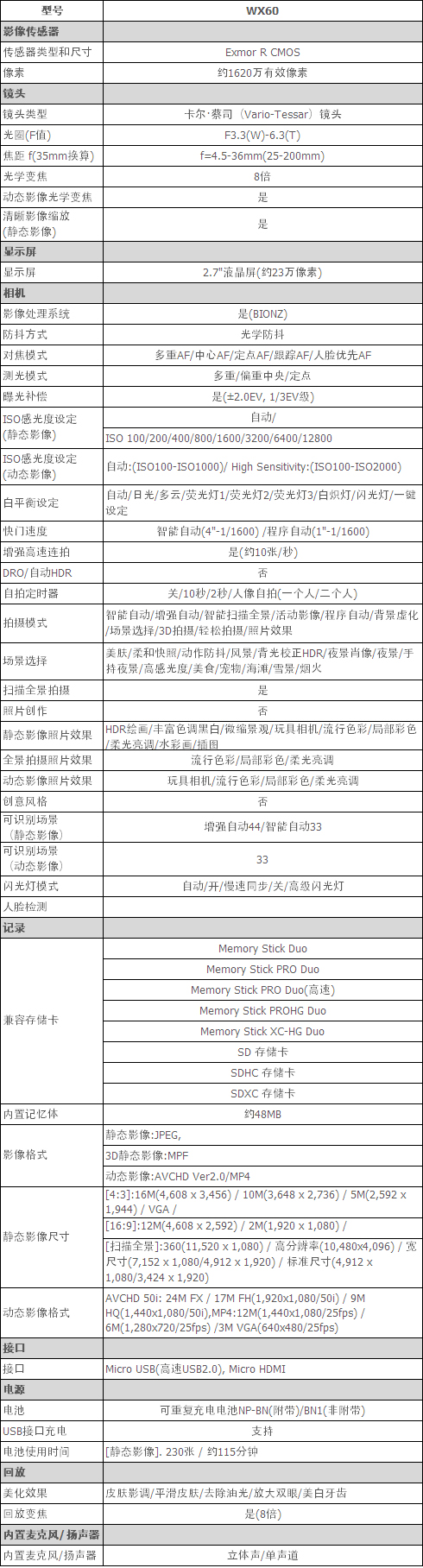 索尼DSC-WX60配备一块1620万像素背照式Exmor R CMOS传感器,配合BIONZ影像处理器可实现高感光度低噪点与优秀的色彩还原能力,即使在昏暗的环境也可以呈现高质量的画质。WX60采用了一枚卡尔•蔡司(Vario-Tessar)8倍(等效35mm画幅焦距25mm-200mm)变焦镜头,卡尔•蔡司镜头作为出色光学性能的代名词,为用户拍摄高质量照片提供了保证;8倍变焦让用户的拍摄视野更加开阔,加上先进的光学防抖功能,保证了WX60优秀稳定的画面表现。