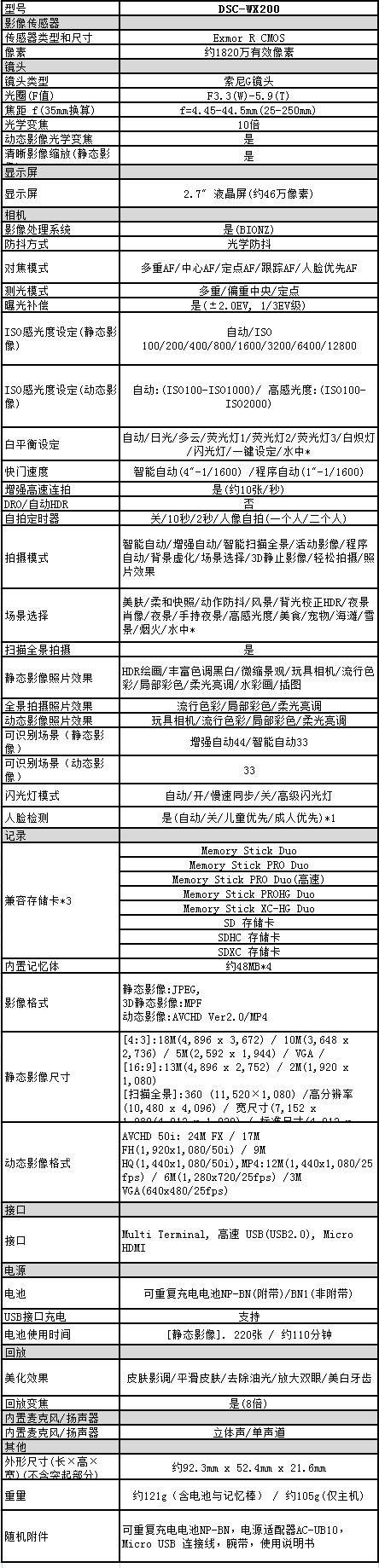 索尼DSC-WX200支持AVCHD格式1920x1080/50i高清动态影像拍摄,机身的光学防抖也可作用在视频拍摄中,视频画面更加清晰稳定,即使手持拍摄的影像也非常的平稳。DSC-WX200还能够同时采用TRILUMINOS 特丽魅彩技术,在连接BRAVIA电视进行照片回放时,无论回放静态照片、视频还是全景影像,均可获得真实自然的色彩再现,将记忆完美重现。