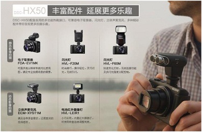 作为H系列的最新产品,DSC-HX50 延续了紧凑机身设计,机身尺寸约为108.1mm x 63.6mm x 38.3mm,相比于传统拥有30倍光学变焦的数码相机更加紧凑便携,更便于用户携带。DSC-HX50提供了黑、银两种颜色供用户选择,机身左侧的手柄表面附有防滑覆皮,舒适的手柄有助于用户单手长时间握持。DSC-HX50配有多功能接口热靴,与A99、NEX-6及RX1上的热靴设计一致,可以与索尼外置闪光灯或电子取景器等配件进行连接,扩展了机身的拍摄功能。相机采用的3.0英寸约92.1万像素XtraFine液晶显示屏,可以清晰展现更多细节。