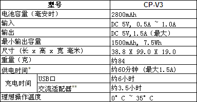 CP-V3 USB移动电源拥有2800mAh容量和1.5A高输出,确保能为外出携带的智能手机再次快速充电,是常有紧急电源需求的城市精英的理想伴侣。
