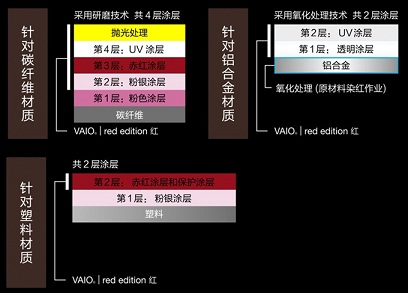 针对采用碳纤维材质的机身表面A面,Pro red edition 红在采用研磨技术后,需依次涂上粉色涂层、粉银涂层、赤红色涂层和UV涂层,并采用抛光处理,使碳纤维表面成为靓丽尊贵红色的同时,更具柔美的光泽感。对于采用塑料材质的屏幕面B面,Pro red edition 红需在粉银涂层之上再涂上赤红涂层和保护涂层,保持整机色彩、质感的统一性。针对采用铝合金材质的键盘面C面,Pro red edition 红也需先采用氧化处理技术,继而依次覆盖上透明涂层和UV涂层,使着色更加稳固耐用、不易磨损。Pro red edition 红凭借外表四层,内里两层的精细工艺,打造出独一无二、完美出众的最美碳纤维超极本。