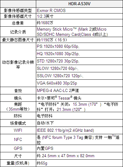 附:《索尼“酷拍”佩戴式摄像机HDR-AS30V主要技术参数表》