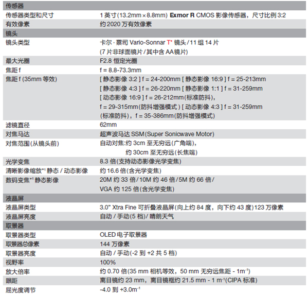 传感器方面,黑卡™RX10采用与黑卡™RX100 II相同的2020万像素,1英寸Exmor R CMOS背照式传感器,感光度范围达ISO125-12800,即使在光线昏暗的环境下也能获得清晰的画质。大尺寸Exmor R CMOS与全新的BIONZ X影像处理器相配合,确保拍摄的影像具有高画质和低噪点特点,再现栩栩如生的影像细节。