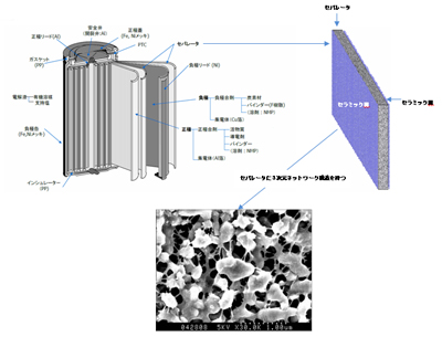 这次采用的分离方法是在不影响透气性以及自身微孔滤膜的强度特性的情况下,增加了用聚烯烃微孔滤膜做的立体网络结构陶瓷层。在万一有金属异物混合进材料的情况下,这层膜能够帮助避免内部网络造成短路,使电池仍然正常工作。高机能分离膜的安全性大幅提升,同时可以实现高能量充放电,为电池高容量化做了贡献。