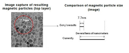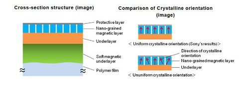 索尼通过研发出一种新的真空薄膜制造技术,制造出极细腻的结晶颗粒,旨在由此创造出切实可用的新一代存储媒体。这项新技术利用物理溅射沉积的方法(一种新的真空薄膜制造技术),在厚度仅为5微米的高分子膜上制造出多层次且朝向相同的结晶颗粒,而此前,当使用物理溅射沉积的方法向高分子膜上安置细磁颗粒时,由于软底层表面不够平滑,使得底层结晶颗粒的朝向不一致。这样,上面的纳米晶粒磁带层也会产生晶体朝向不一致以及细磁颗粒大小不一的现象,令增加存储密度无法实现。通过优化物理溅射条件和独立开发向一种具有平滑表面的软磁带底层,索尼使降低晶体长度及生长方向不一致成为可能。由此制造出来的纳米晶粒磁带层上的细磁颗粒平均大小为7.7纳米。如果使用一种研发中的记录和验证方式去评测使用了这种技术的磁带,就会得出148GB/平方英寸的全球最高存储密度,相当于传统主流涂层磁带的74倍。