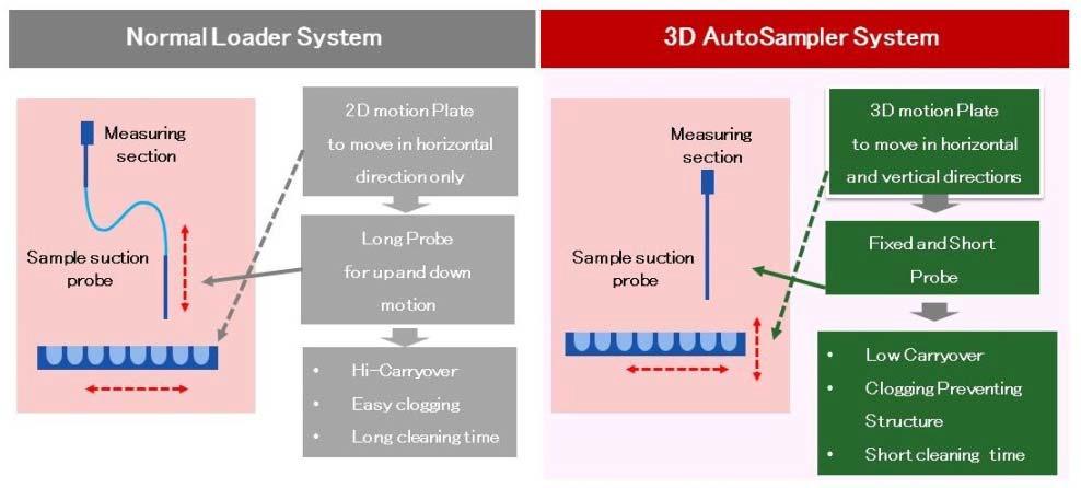 在传统的自动取样器中,孔板采取水平式移动,而试样探针2则是垂直移动来收集样本,这就导致样本需要来回移动较长的距离才能被采集到,这将有可能影响处理速度和样本残留率(样本间交叉感染的几率)。SA3800中的新款自动取样器使用了固定试样探针和可3轴(X,Y, Z 轴)移动的孔板,可以加速样本取样及分析过程。同时,该取样探针还自带自我清洁功能,可以进一步将样本残留率降低至0.1%或以下。这些独特性能将保证SA3800实现高速且稳定的样本收集,这在大量样本的分析工作中将是一个极受欢迎的产品特性。