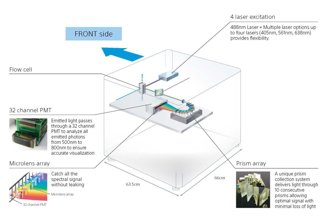 ① 在不进行滤光的情况下,荧光波长将被索尼独家设计的棱镜所分解。在使用32通道的光电倍增管之后,可对荧光波形进行高度准确的分析。