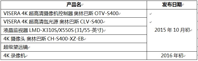 (9月16日)奥林巴斯公司宣布发布一款整合4K技术的手术内窥镜系统,该产品将于2015年10月上旬在日本及欧洲首发。该产品技术由索尼奥林巴斯医疗解决方案公司研发,该公司为索尼及奥林巴斯的合资医疗公司。
