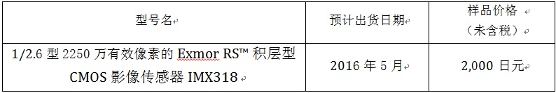 (2016年2月16日,东京)索尼公司(以下简称“索尼”)今天宣布其Exmor RS™积层型 CMOS影像传感器IMX 318 的商品化,该款新品适用于智能手机及其它要求兼具更优拍摄功能和更小尺寸的电子设备。IMX318 为1/2.6型积层型 CMOS影像传感器,其有效像素达到2,250万,同时它的尺寸更小、具有更高图像质量及更好的性能。IMX318在业内首创*1内置速度快至0.03秒*2的高速复合自动对焦(“AF”)功能,同时内置可用于视频拍摄的3轴电子图像稳定技术。索尼计划将于2016年5月开始出货该款CMOS影像传感器新品。
