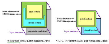 “Exmor RS”采用了独特的“堆叠式结构”。该结构将承载背照式像素结构的像素部分叠放于附着信号处理电路的芯片上方,取代了用于背照式CMOS影像传感器的传统的支撑衬底。