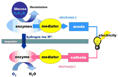 利用碳水化合物、蛋白质、氨基酸、脂肪等能源,通过分解酶来发电的一种装置。自2001年以来,索尼的研究已经得到了日本京都大学农业研究生院应用生命科学分院Kenji Kano教授实验室(前Tokuji Ikeda教授实验室)的支持,该实验室专门从事生物化学研究。这里阐述的研究结果是基于,索尼在该实验室的先进科研活动激发下最初开展的技术开发。