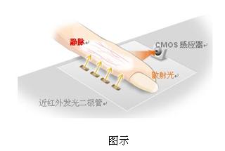 “mofiria”采用了独特的方法:一个CMOS感应器斜向捕捉手指静脉内部透过的散射光,从而形成一个平面图案;可以实现微型和更为灵活的设计以将此项技术植入移动设备中。